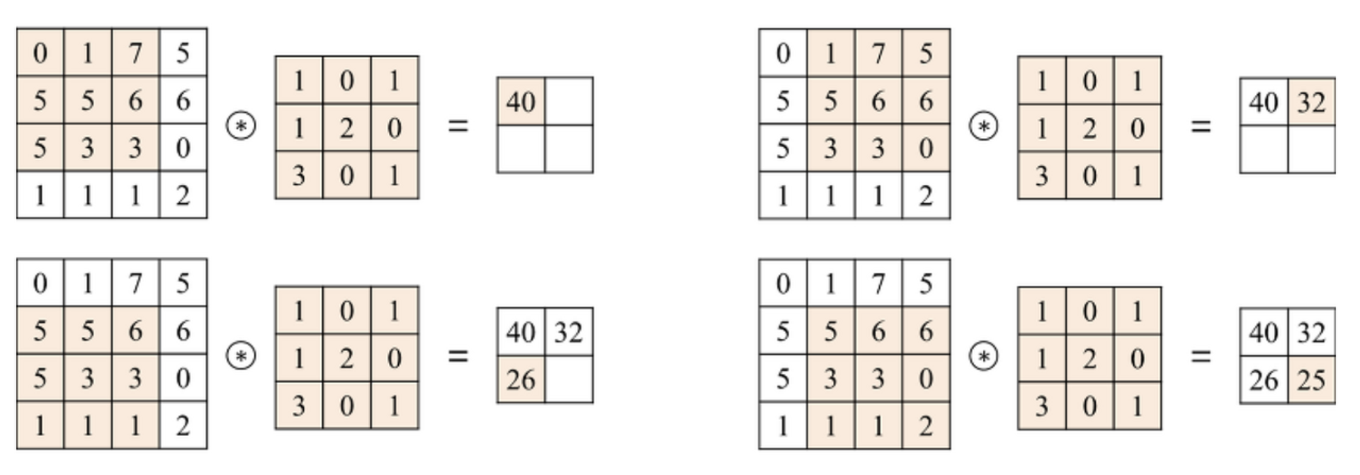 합성곱 연산의 순서는 왼쪽 위에서 오른쪽으로 스캔하는 방식으로 이뤄지며, 입력과 필터에서 동일한 위치에 대응되는 원소끼리 곱하여 진행한다.