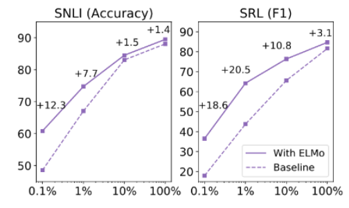 또한 학습데이터가 작을수록 ELMo 를 사용하면 더 효율적인 학습이 가능하다는 것도 확인할 수 있었다. 이는 사전학습된 단어 임베딩이 랜덤 초기화된 임베딩보다 더 많은 정보를 제공하기 때문에 학습 수렴이 빠른 것도 확인하였다..