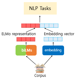 ELMo는 이어 붙여진 언어모델로 학습된 `bidirectional Language Model(biLM)으로부터 얻은 벡터를 사용한다.