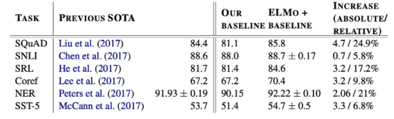 6개의 NLP 성능평가에서 ELMo를 적용한 결과 기존 SOT모델의 성능을 뛰어넘었으며,