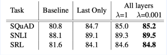 이는 lower layer에서는(입력에 가까운층)품사 등의 문법정보를 높은 단계에서는 문맥정보를 학습하는 경향이 있기 때문에 이러한 것들을 모두 반영하고자 한 것이다.