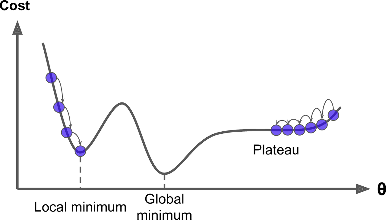 우선 지역최소값(local minima)는 손실함수의 특정영역에서 가장 낮은 점을 의미하고, 전역최소값은 손실함수 전체에서 가장 낮은 점을 의미한다. 우리의 목표는 손실함수 내의 최소값인 Global minima를 찾는 것이 목표이지만, 한번 지역해에 빠지면 모델의 학습이 더 이상 진행되지 않기 때문에 초기 가중치나, learning rate를 적절하게 선정하여 지역해에 빠지지 않도록 해야 한다.
