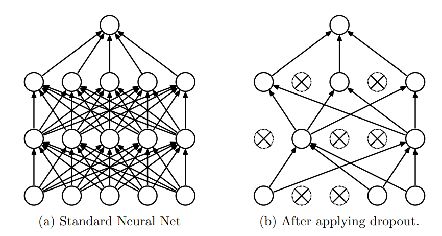 드롭아웃 Dropout은 모델 학습 시, 임의의 가중치 노드를 일정확률로 비활성화시키는 방법으로 학습이 잘 된 모델은 일부노드를 비활성화시켜도 여전히 좋은 성능을 유지할 것이라는 가정을 깔고 간다.