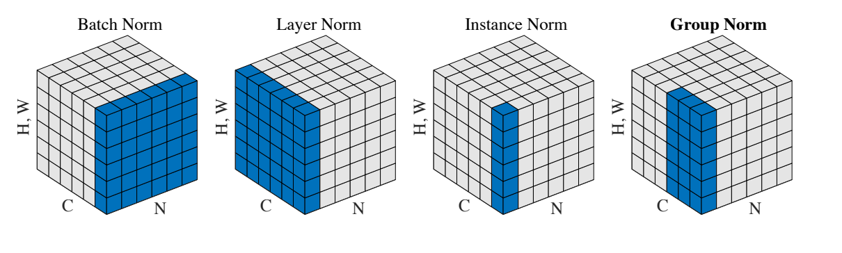 그룹정규화는 인스턴스 정규화의 확장버전으로 채널을 여러 그룹으로 나눈 뒤에, 각 그룹 내에서의 평균과 분산을 계산하여 정규화하는 방법이다. 이 또한 배치 사이즈가 적을 경우를 대비하기 위한 방법이다.