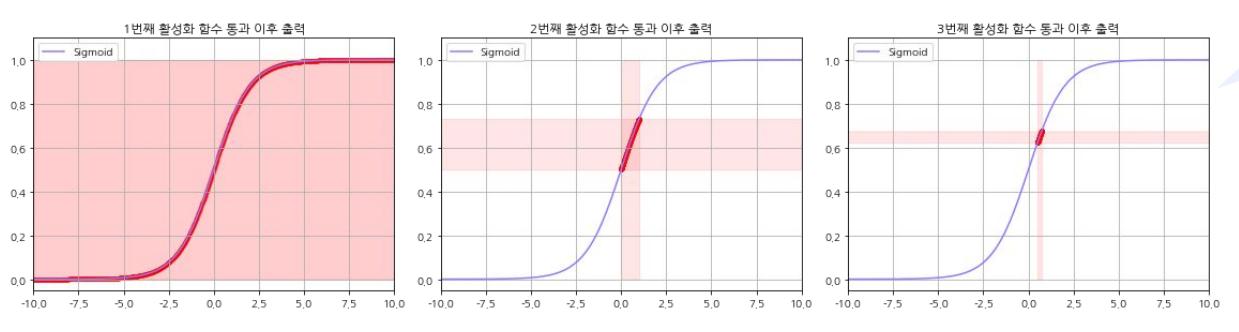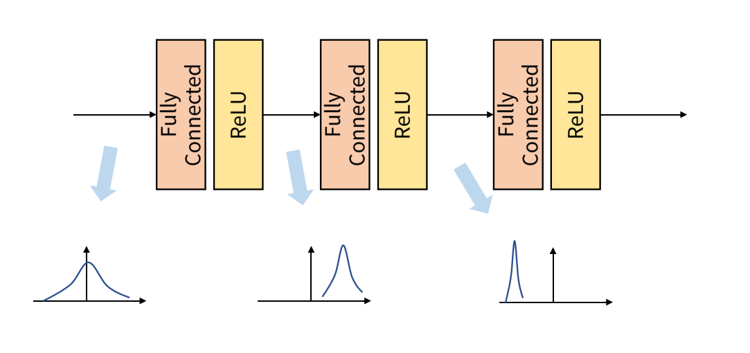 간단하게 살펴보면 첫 번째 레이어에서 활성화함수가 시그모이드라고 할 때, 이 출력은 0~1이 나올 것이다. 이후 2번째 레이어에서 가중치와 편향을 잠깐 생략해서 생각해 보자. 0~1 사이의 출력이 다음 활성화 함수로 들어가면 출력의 범위가 더 줄어들 것이다. 이렇게 입력과 출력 데이터가 점점 한쪽으로 편향되는 현상이 발생한다. 이를 Internal Covaiant Shift라고 한다. 이는 기울기 소실 혹은 폭발 문제에 이를 수도 있다.