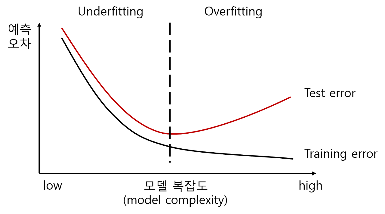 모델 훈련과정에서 학습데이터의 오차가 일반화 오차에 비해서 현격하게 낮아지는 현상을 Overfitting(과적합)이라고 부르고, 학습데이터의 오차가 매우 큰, 정확히 예측하지 못할 경우 Underfitting(과소적합)되었다고 부른다.