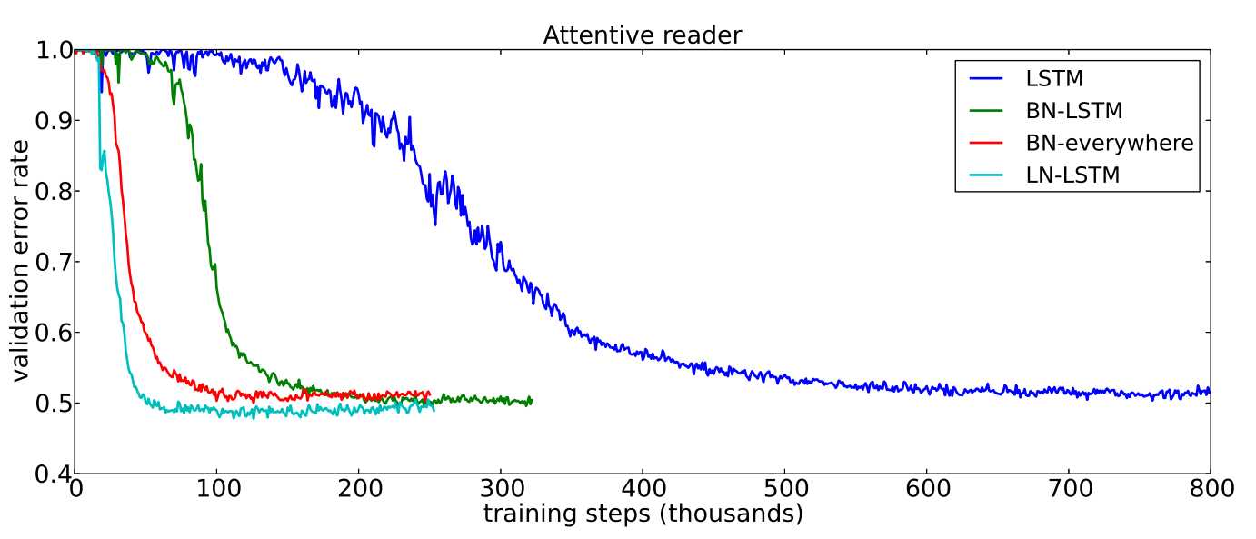 위와 같이 데이터가 들어왔을 때 layer normalization은 각 데이터 내부의 정규화를 진행한다. 이에 배치사이즈에 영향을 받지 않는다. 아래의 결과에서 보다시피 RNN구조의 모델 실험에서 배치정규화보다 빠른 수렴을 보여줬다.