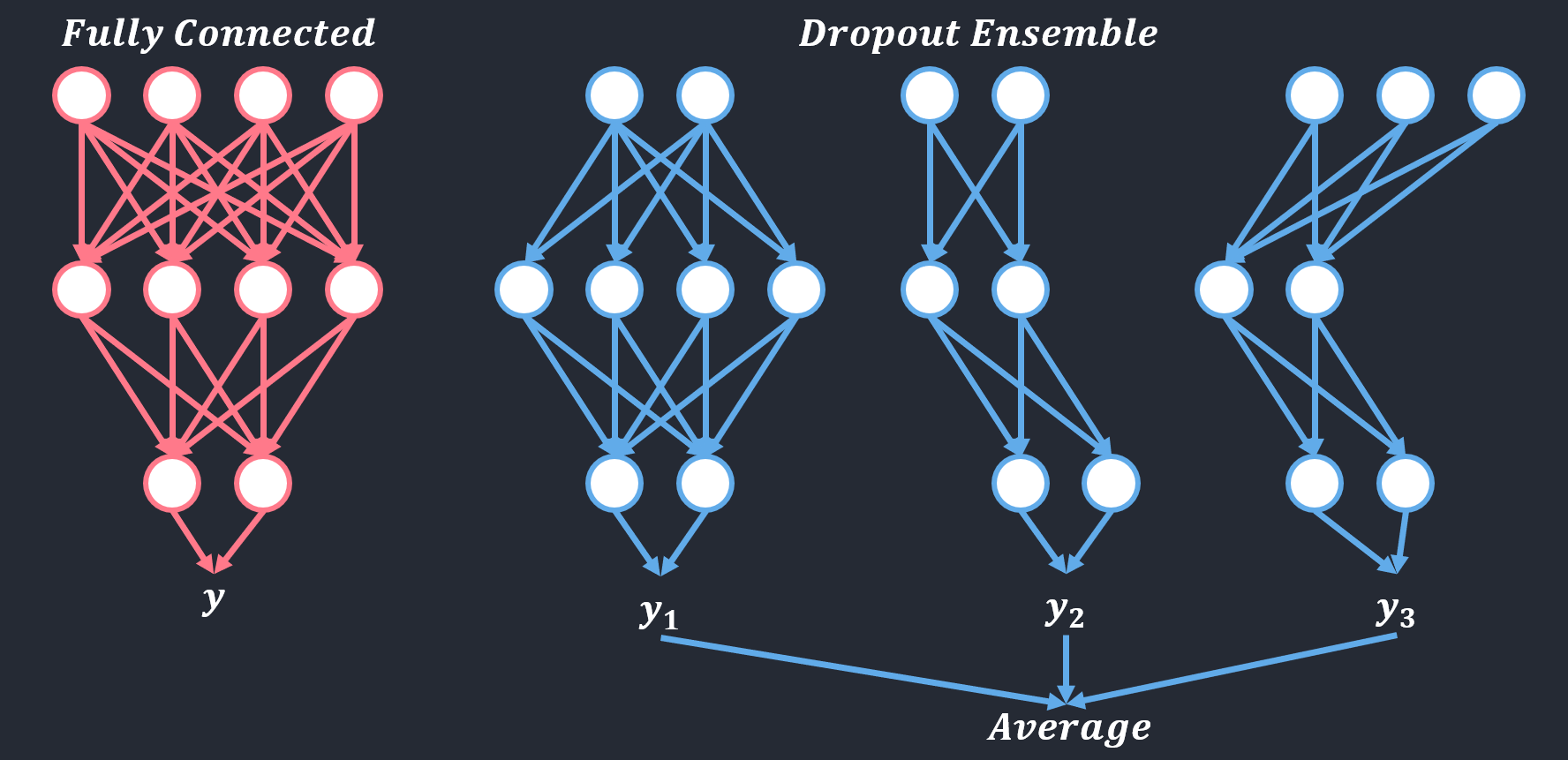 또한 드롭아웃은 앙상블이 되는 효과가 있는데, 여기서 앙상블이란 개별적으로 학습 시킨 여러 모델의 결과를 종합하여 추론하는 방식인데, 이 드랍아웃이 적용될 때 매 epoch마다 랜덤으로 노드를 삭제시키기 때문에 각기 다른 모델을 학습시키는 것으로 해석 가능하고 추론시에는 모든 뉴런을 사용한다.