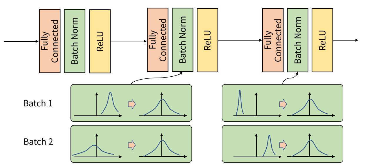또한 이것과 유사하게 배치 단위로 학습을 하게 되어도 배치 단위 간 데이터 분포가 날 수도 있다. 이를 해결하기 위해 배치정규화를 실시한다. 각 배치별로 데이터가 다양한 분포를 가지더라도 출력의 형태가 같아지도록 하려면 논문에 의하면 fully connect layer 이후, 활성화 함수 이전에 적용하여야 한다고 한다.