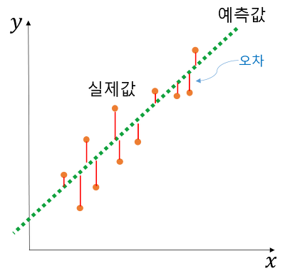 이 선형회귀의 관계식을 찾을 때 실제 현실에서는 오차가 0일 수없기 때문에 선형회귀란, 오차가 가장 적게 되는, 즉 관계를 가장 잘 대변하는 식을 찾는 것이라고 할 수 있다.