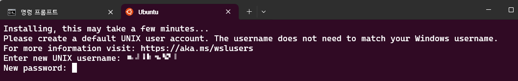 들어가면 `username`과 `password`를 정하라는 창이 나올 것이고, 이것은 자신이 설정해 주면 된다.(pw는 칠 때 안 보이는 게 정상입니다)