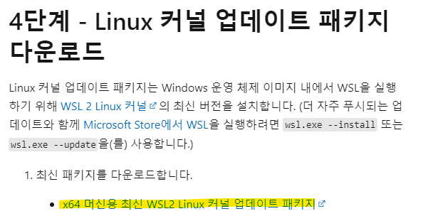 위의 링크를 들어간후 해당 단락을 찾아서 `x64 머신용 최신 WSL2 Linux 커널 업데이트 패키지`를 설치해 준다.