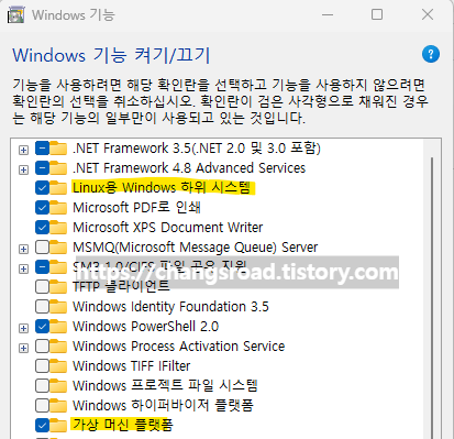이후, `Linux용 Windows 하위 시스템`과 `가상 머신 플랫폼`을 활성화 시켜주고 pc를 재부팅해준다.