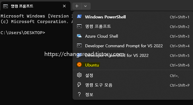 이후 Ubuntu가 정상적으로 설치가 완료되면 프롬프트 오른쪽의 드롭다운을 클릭하면 Ubuntu를 선택할 수 있게 된다.