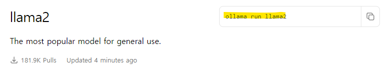 ollama를 구동한뒤에 새로운 ubuntu prompt를 열어서 ollama의 모델 library를 참고하여 자신이 원하는 LLM 모델을 로컬에 설치할 수 있다. 각 원하는 모델에 들어가면 설치할 수 있는 명령어가 나오게 된다.