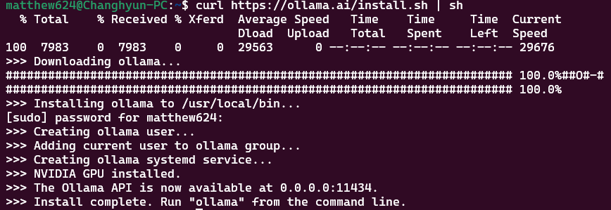 위의 세팅까지 마쳤다면 이제 ollama 사이트에 있는 linux용 설치 명령어를 이용해 위의 Ubuntu prompt에서 실행시켜 준다.