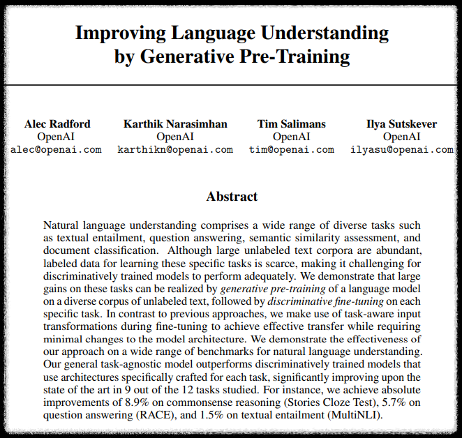 GPT 모델은 2018년에 OpenAI에서 "Improving Language Understanding by Generative Pre-Training"이라는 논문에서 처음 등장하였다.
