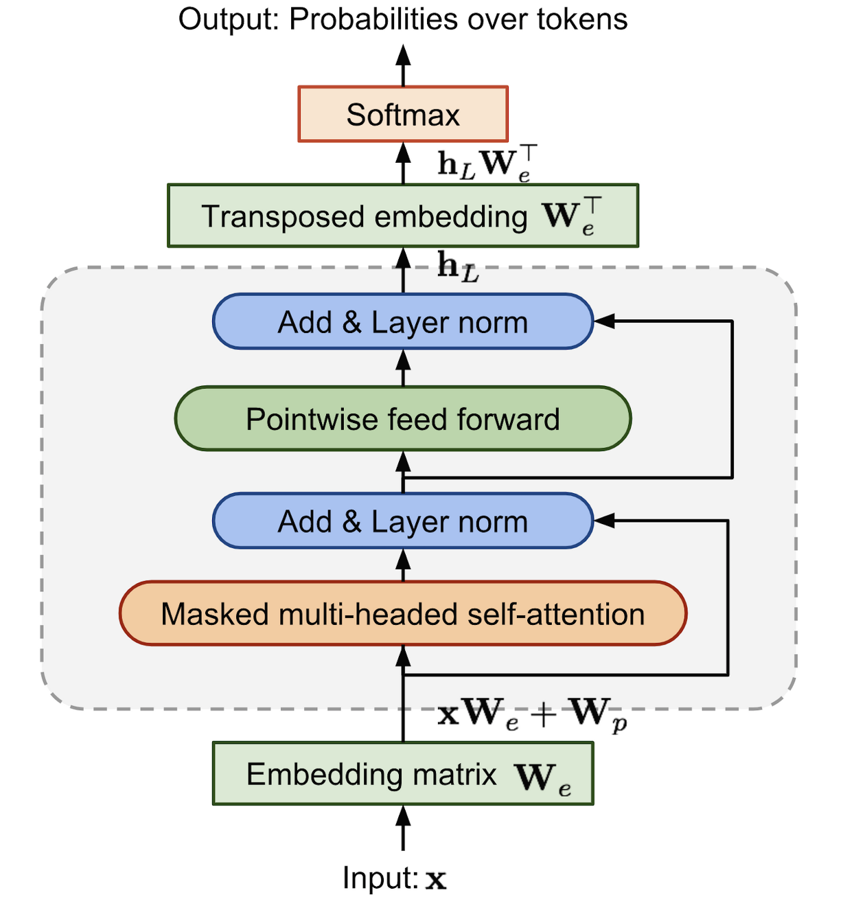 우선 input token Matrix $U$에 embedding Matrix $W_e$를 곱한 후, Positional embedding $W_p$를 더해 Masked self-Attention을 위한 input$h_0$을 만들어준다.