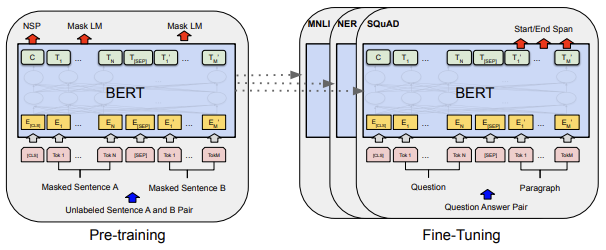 논문에서 BERT를 `Pre-training part`와 `Fine-tuning part`로 나누어 설명하는데, Pre-training에서는 다양한 사전학습된 task의 unlabeled data를 활용하여 파라미터를 설정하고 이를 바탕으로 학습된 모델은 Fine-tuning 단계에서 진행하고자 하는 task의 labeled data를 이용하여 파인튜닝을 진행한다.