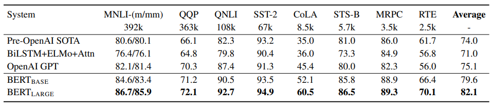 BERT는 GLUE라는 NLU 능력을 평가하기 위한 9가지 Task로 구성된 데이터셋에 맞게 fine-tuning을 진행하여 SOTA를 달성하였다.