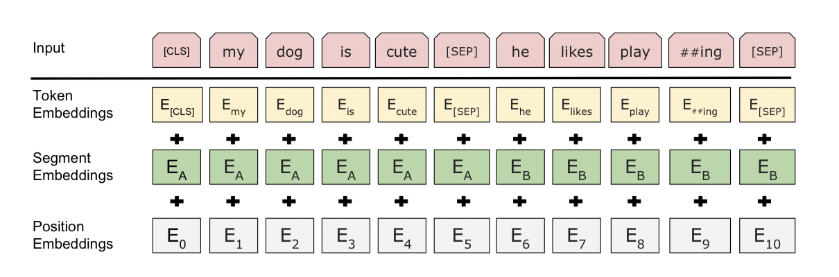 이를 위해 총 3가지의 Embedding vector(Token embedding + Segment embedding + Position embedding)을 사용했다.