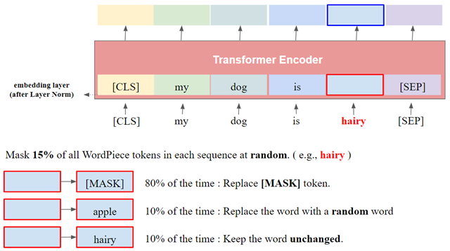 그런데, fine tuning 단계에서는 [MASK] 토큰이 안 들어오기 때문에 사전학습과 파인튜닝 과정 간의 mismatch가 발생하고 이를 방지하기 위해 전체 15%의 [MASK] 토큰에 추가적인 작업을 진행한다. 그 [MASK] 토큰에서 80%는 [MASK] 토큰으로 바꾸고, 10%는 random word로 바꾸고, 10%는 원래 단어 그대로 나누는 방식을 사용했다.