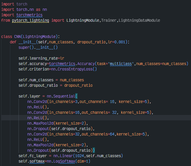 `__init__`에서 다른점은 우선 상속받는 모듈이 PyTorch에서는 `nn.Module`이고, Lightning에서는 `LightningModule`이라는 점과, Pytorch에서는 optimizer이나 evaluate 등을 따로 구현하기 때문에 init에 포함하지 않지만 Lightning의 경우에는 learning rate, accuracy, loss를 따로 정의해준 것을 볼 수 있다.