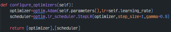 PyTorch에서는 외부에서 최적화 알고리즘과 스케쥴러를 설정해 줬는데, Lightning에서는 같은 클래스 안에 정의한다.