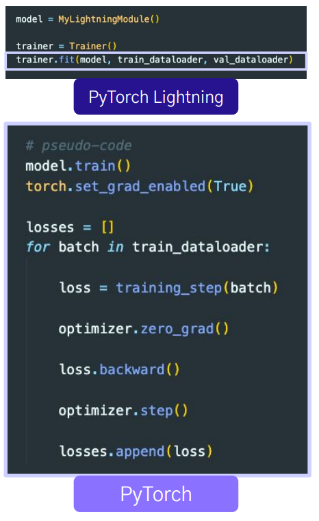 기존의 PyTorch는 `model`. `optimizer`,`training loop`를 전부 따로따로 구현해야 했다. 그러나 PyTorch Lightning에서는 `LightningModule`이라는 클래스 안에서 모든 것을 한 번에 구현할 수 있다. 추가적으로 기존의 PyTorch에서는 GPU를 사용하려면, `. to(device)`와 같은 형식으로 하드웨어를 넘겨줬어야 하는데, Lightning에서는 사용가능한 GPU가 있다면 우선적으로 사용된다.
