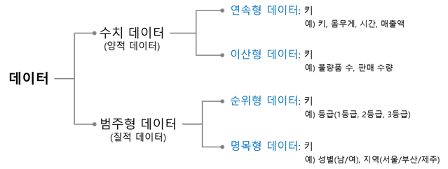 우선 데이터, 변수는 위와 같이 크게는 수치형과 범주형으로 나뉘고 각각 연속형과 이산형 그리고 순위형과 명목형으로 분류된다. 모델에 input 데이터를 넣기전에 연속형이나 범주형 변수의 처리를 진행해줘야 제대로 모델이 돌아가며 성능이 좋아질 수 있다.