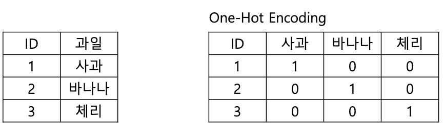 원-핫 인코딩이란 범주형 변수를 0과 1로만 표현되도록 변환하는 방법이다. 해당 범주형 변수의 총 범주개수만큼의 벡터를 만들고 해당 벡터를 0혹은 1로 채우는 방식이다.