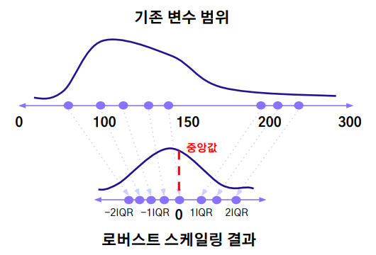 중앙값과의 거리를 IQR로 나누어 중앙값에 가까워질수록 0으로, 중앙값에서 멀어질수록 큰 값으로 변환한다. 중앙값을 사용함으로써 이상치에 강건하다는 장점이 있다.