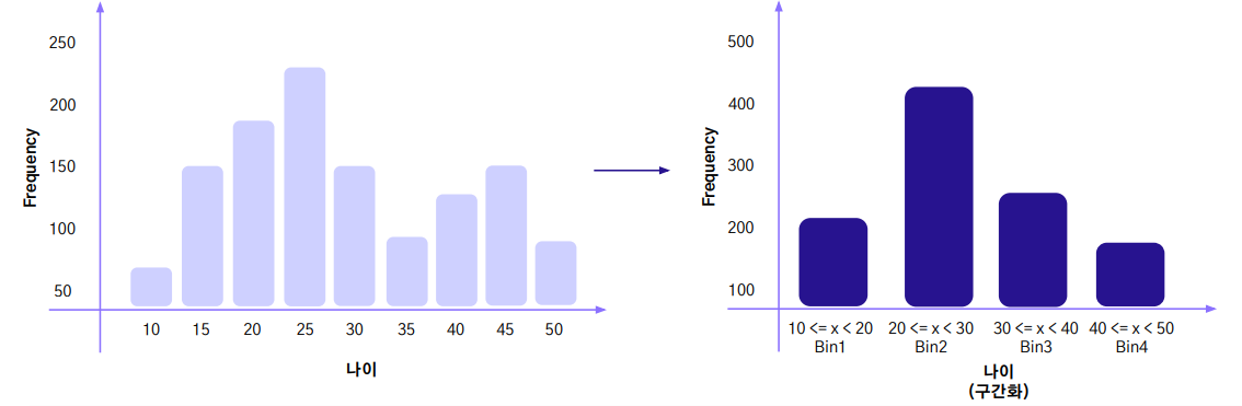 구간화는 수치형 변수를 범주형 변수로 전환시키는 방법을 말한다. 범주화시킴으로써 모델의 복잡도가 줄어든다는 장점이 있다.
