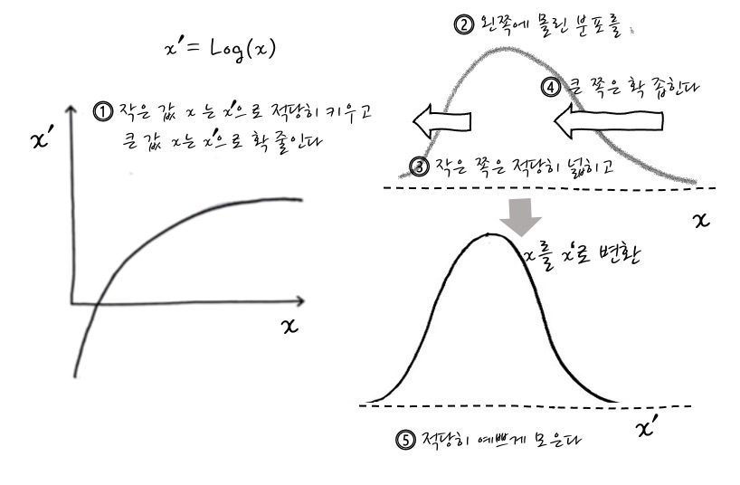 로그변환이란 비대칭된 임의의 분포를 정규분포에 가깝게 전환시키는 역할을 한다. 데이터를 정규화시키는 것은 모델의 성능을 향상시키는데 도움을 주며, 로그화를 통해서 데이터의 스케일을 작게 만들어 데이터 간의 편차를 줄이는데 도움을 준다. 예를 들어 데이터가 `10`,`100`,`1000` 이었던 것을 로그변환을 하면 `1`,`2`,`3`으로 줄어든다