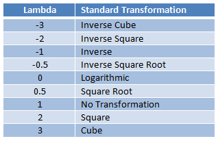 Box-Cox 변환은 $\lambda$에 따라 다양한 변환을 하는 방법으로 목적에 맞게 적절한 $\lambda$를 찾아야한다. $\lambda$에 따른 변환은 아래와 같다.