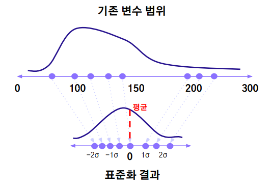 표준화는 변수의 스케일을 평균이 0, 표준편차가 1이 되도록 변환하는 것이다. 즉 정규분포를 따르게 하는 것이다.
