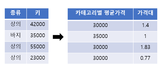 데이터 집계 후 평균, 중앙, 최대, 최소 등의 통계치를 파생 변수로 적용하는 방법으로 해당 관측치가 전체에서 차지하는 상대적인 위치를 쉽게 표현 가능하다.