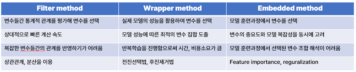대표적인 변수 선택법 `Filter method`, `Wrapper method`, `Embedded method`가 있다.