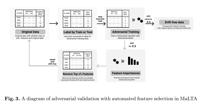 이 방법은 학습 데이터셋과 검증 데이터셋이 얼마나 유사한지를 판단함으로써 과적합을 유발하는 feature을 제거하는 방법이다. 우선 학습 데이터셋의 target을 1로, 검증 데이터셋의 target을 0으로 지정하고 이진분류를 진행한다. 이때 이진분류의 결과가 좋다면, 학습데이터셋과 검증 데이터셋이 경향이 구별되는 어떤 특징이 있다는 것이고, 학습 데이터셋과 검증 데이터셋의 분류 성능이 낮다면 둘 사이의 경향이 다르다는 것이다. 이러한 분류에 도움이 되는 feature은 과적합을 유발하기 떄문에 제거해볼 수 있다.