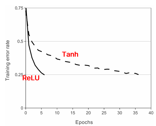 각 레이어들의 input과 output은 위와 같으며, 각 convolution layer을 거치고 나서는 활성화 함수로 `ReLU`함수를 거치는데, 기존에 사용되던 `Tanh`대신 ReLU를 사용하게 된 이유는 실험을 통해 ReLU를 사용했을 때, 동일 정확도대비 6배나 빠른 속도를 보였다고 한다. 그렇게 AlexNet 이후 많은 모델들이 ReLU함수를 활성화함수로 사용하게 되었다.