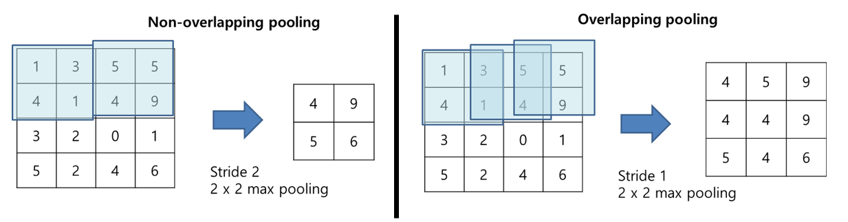 Overlapping pooling이란 stride를 커널 사이즈보다 작게 설정하여 겹치게 되는 것을 의미한다.