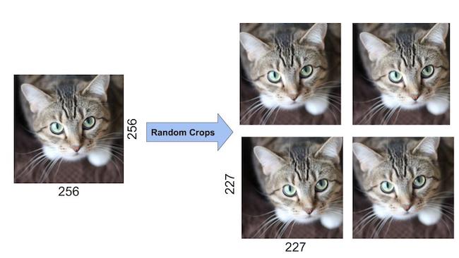 우선 256x256 size의 이미지를 이미지의 랜덤 한 부분을 crop하여 227*227 size의 이미지를 만들고, 각 crop된 이미지들을 좌우 대칭 시키거나 뒤집어서 데이터를 증강시켰다.