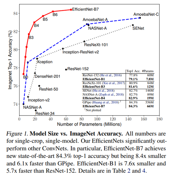 이렇게 모델 깊이나 너비가 크고 입력 이미지의 스케일이 커질수록 성능이 잘 나오는 것은 이미 알려진 사실이었지만 그렇게 될수록 파라미터의 수가 급증하기 때문에 필요한 리소스나 시간이 더 많아지게 되었다.