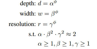 논문에서 제공한 Compound scaling을 하는 방식은 다음과 같다. 우선 $ \alpha, \beta, \gamma $는 grid search를 통해 찾아지는 상수이며, $\phi$는 주어진 연산량에 따라 사용자가 결정하는 상수이다. 이 $\phi$에 따라 Efficient net의 버전 b0, b1~가 달라진다.
