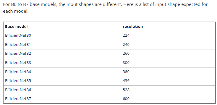 efficientnet의 각 버전에 따른 최적의 input size는 다음과 같다고 한다. 물론 다르게 넣어도 되지만 실험에서의 가장 최적값이라고 한다.