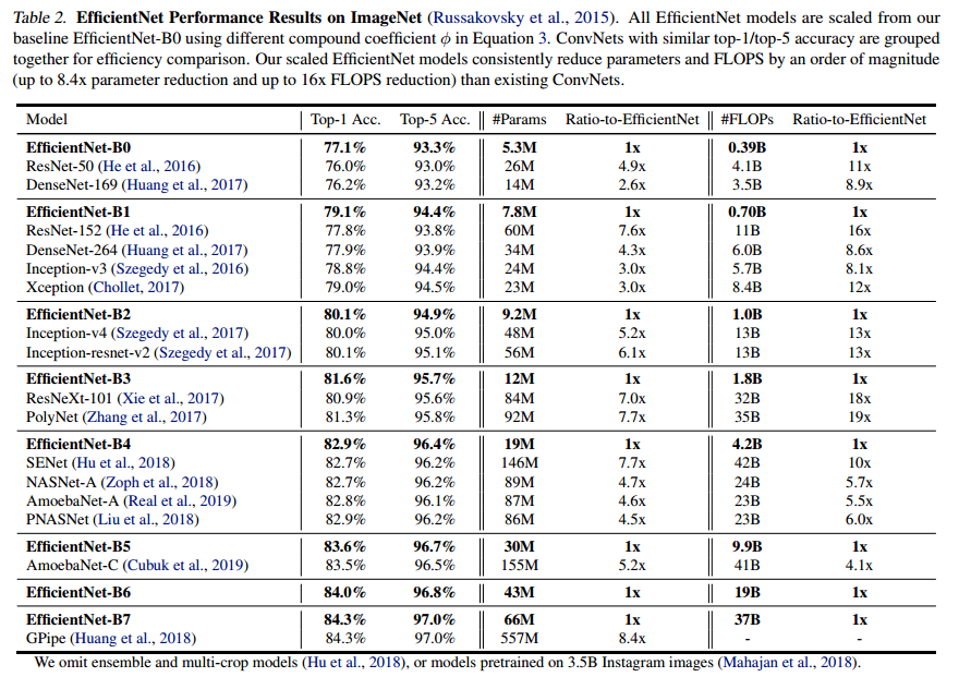 이를 ImageNet 데이터셋에도 동일하게 적용하여 동일 파라미터 수를 가진 기존 모델 대비 훨씬 적은 FlOPS와 더 높은 accuracy를 달성하여 Compound scaling의 유의미함을 입증하였다.