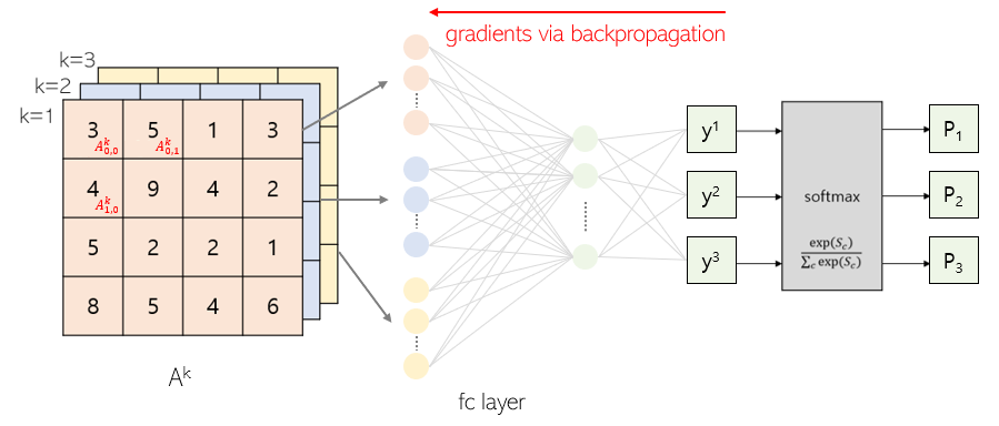 위의 그림에서 softmax를 취하기전의 결괏값을 $y^{c}$라고 할 때 마지막 convolution layer의 feature map $A^{k}$에 대한 영향을 구하려고 하면 해당 그래디언트 값을 구하면 된다. 즉 $ \frac{\partial{y^{c}}}{\partial{A^{k}}} $ 를 구해볼 수 있다.