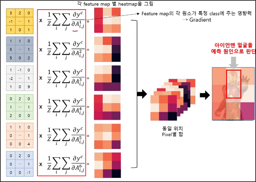 CAM은 Global average pooling layer가 없는 모델들에 한해서는 사용하기 어려웠고(사용하려면 모델 재학습 필요), 마지막 feature map에 대한 것만 시각화할 수 있다는 단점이 존재하였다.