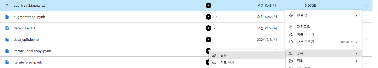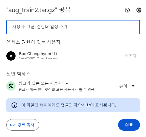자신의 구글드라이브에서 다운로드하고자 하는 파일의 공유를 누르고, 링크가 있는 모든 사용자에게 공유로 바꾼다음 링크를 복사한다.