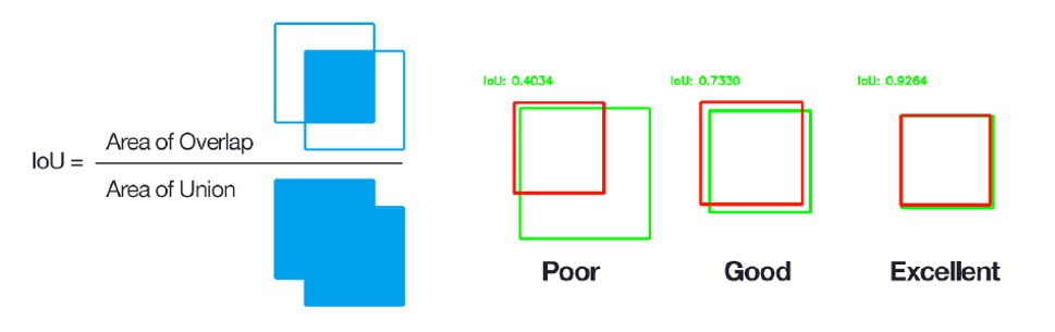 `IoU`: Intersection over Union의 약자로, Bounding Box의 겹치는 영역의 크기를 통해 정확도를 평가하는 방법